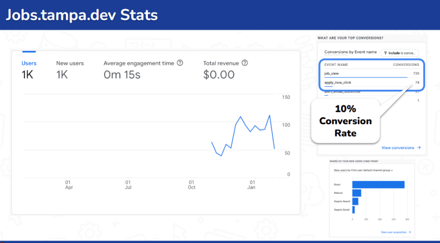 We have held 27 events so far, and we have received a total of 1,903 RSVPs. Our website has also attracted close to 1,000 new users since we started analyzing traffic a few months ago. We have developed an in-house job board application that has roughly 1,000 impressions since we launched it a few months ago. You can read more about this on this post.