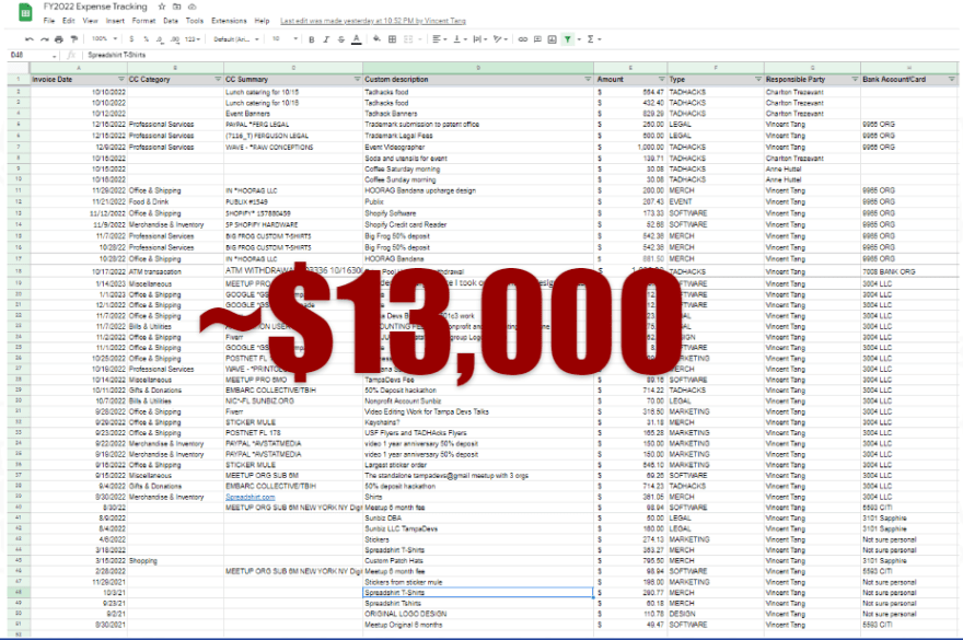 Our startup costs were substantial, but the overhead costs of running Tampa Devs are quite low. From September 2021 to February 2023, we spent the following amounts in various categories: