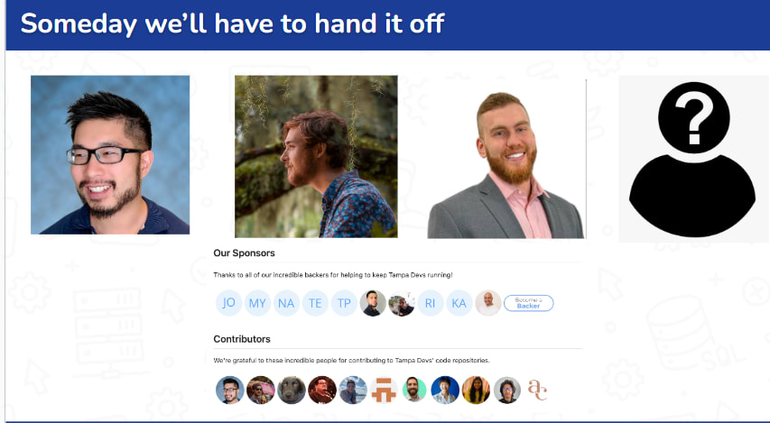 The reason we're doing al these infrastructural changes is because we have seen many past organizations fail after the main organizer leads. Charlton and I want to be able to retire effectively at some point in the future, and know everything is in working order.